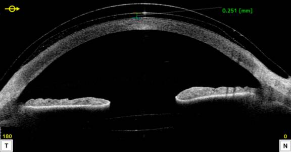 Mme G., 18 ans et sans antécédents particuliers hormis un terrain allergique, nous a été adressée en 2013 au CHRU de Lille pour un kératocône évolutif. L’examen initial retrouvait un astigmatisme important de 6 D lié à un kératocône de stade I. Son acuité visuelle était relativement préservée après une correction optique adaptée (10f/10 et 8/10), mais on notait une amélioration de l’acuité au trou sténopéique, ce qui présageait un gain en lentilles rigides.